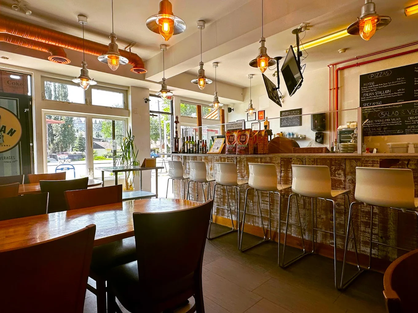 Two Calgary locations serving 100% gluten-free, organic, fire-roasted flatbread pizza with dine-in, takeout, delivery, and catering
